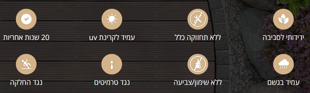 - דק סינטטי בצבע חום אגוז כולל תשתית ומחברים מוגני UV עם סיבי פחם להתקנה נסתרת ו20 שנות אחריות ב399 ש"ח למ"ר